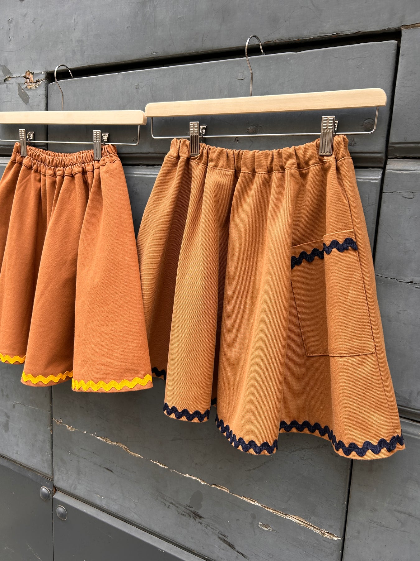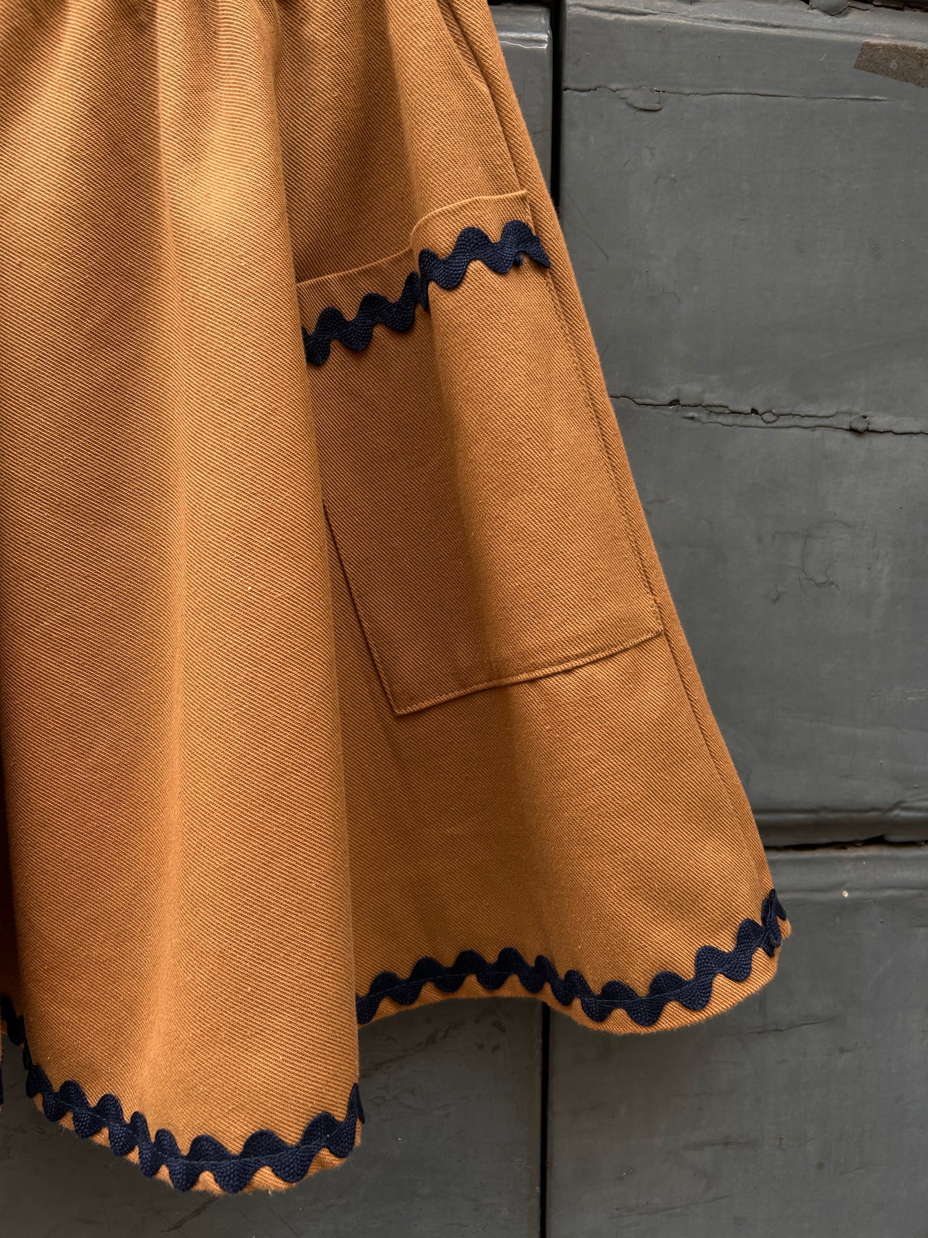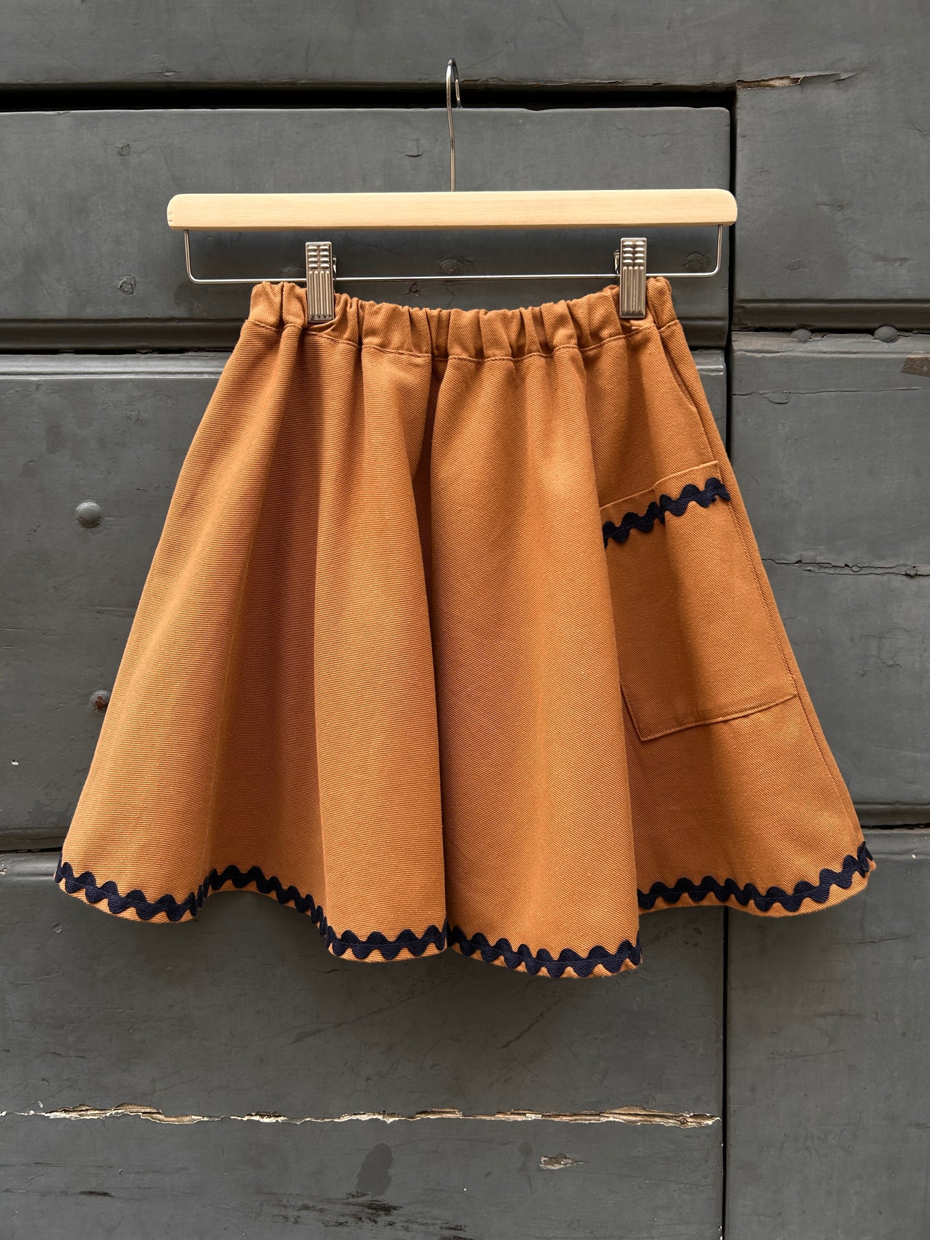 Deliziosa gonna a ruota con tasca laterale, lunghezza al ginocchio, in cotone strutturato.