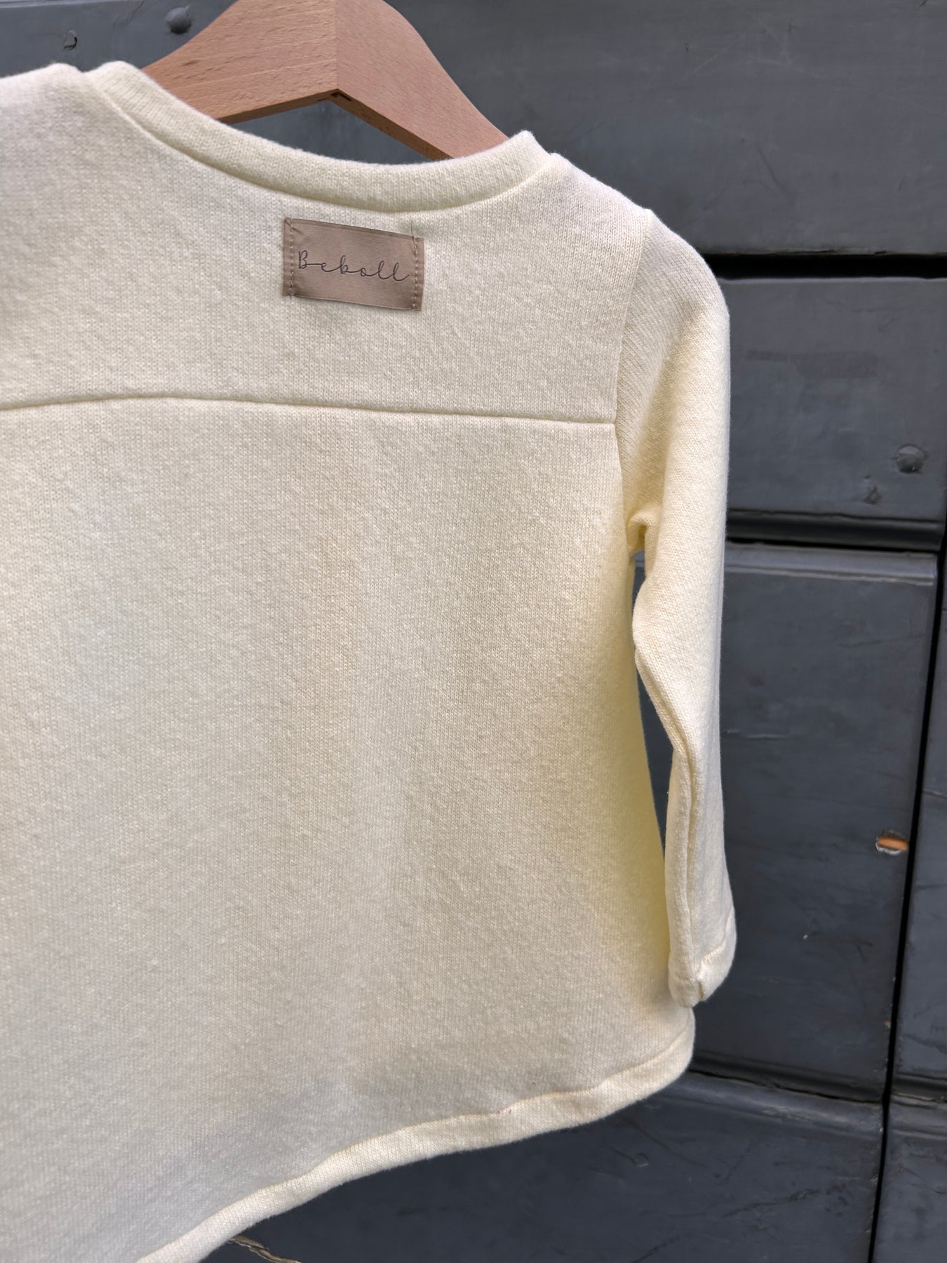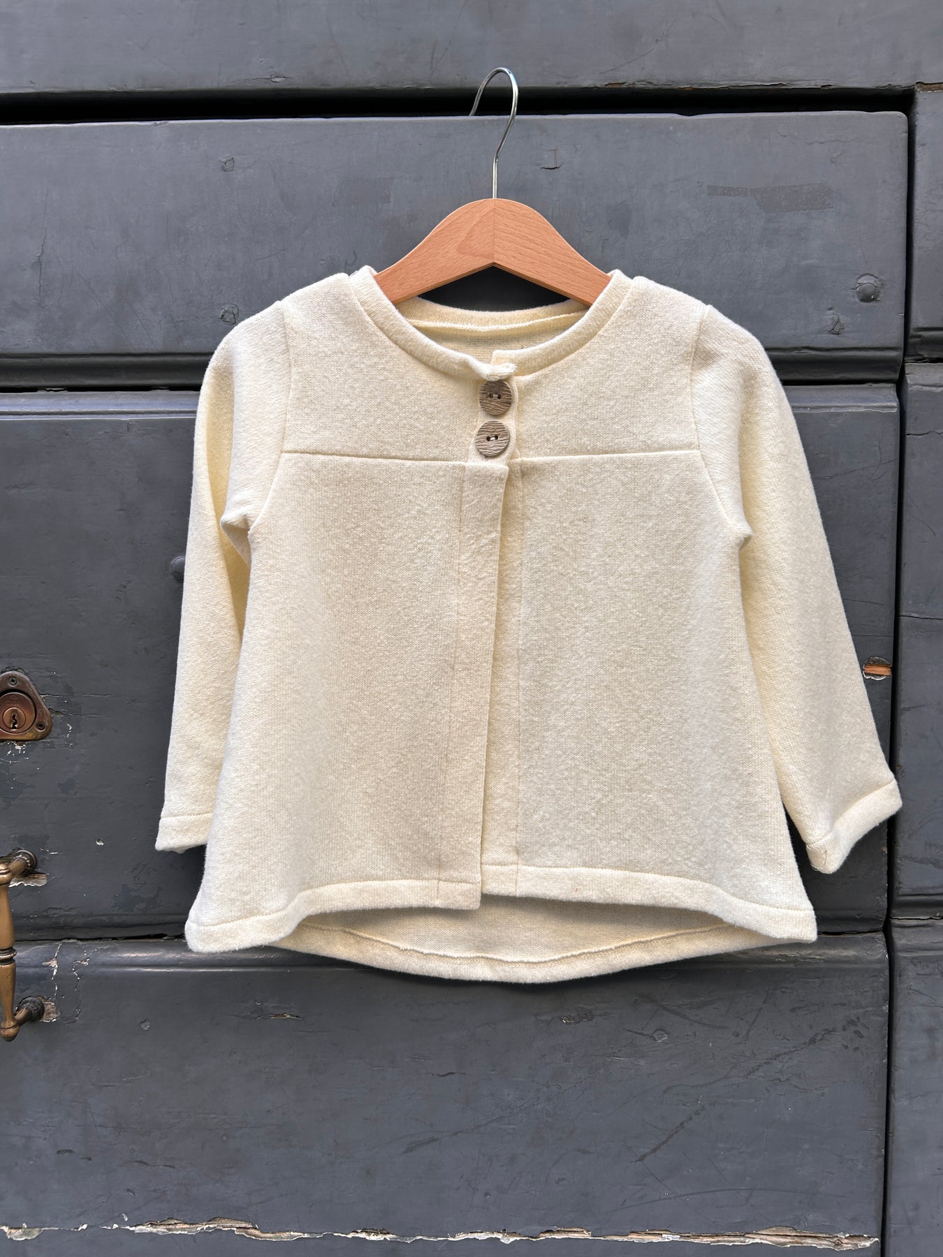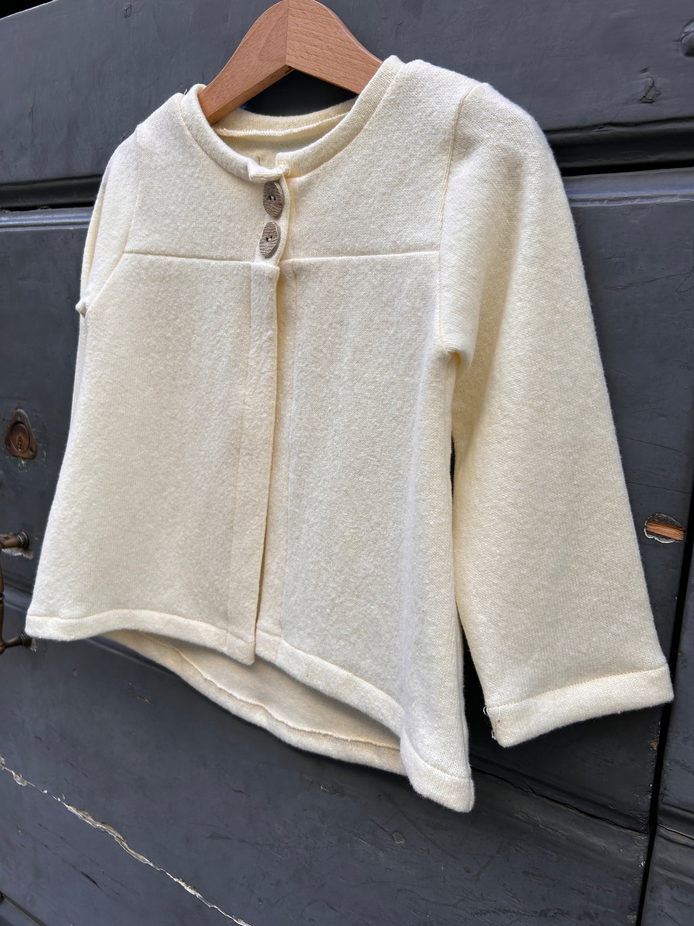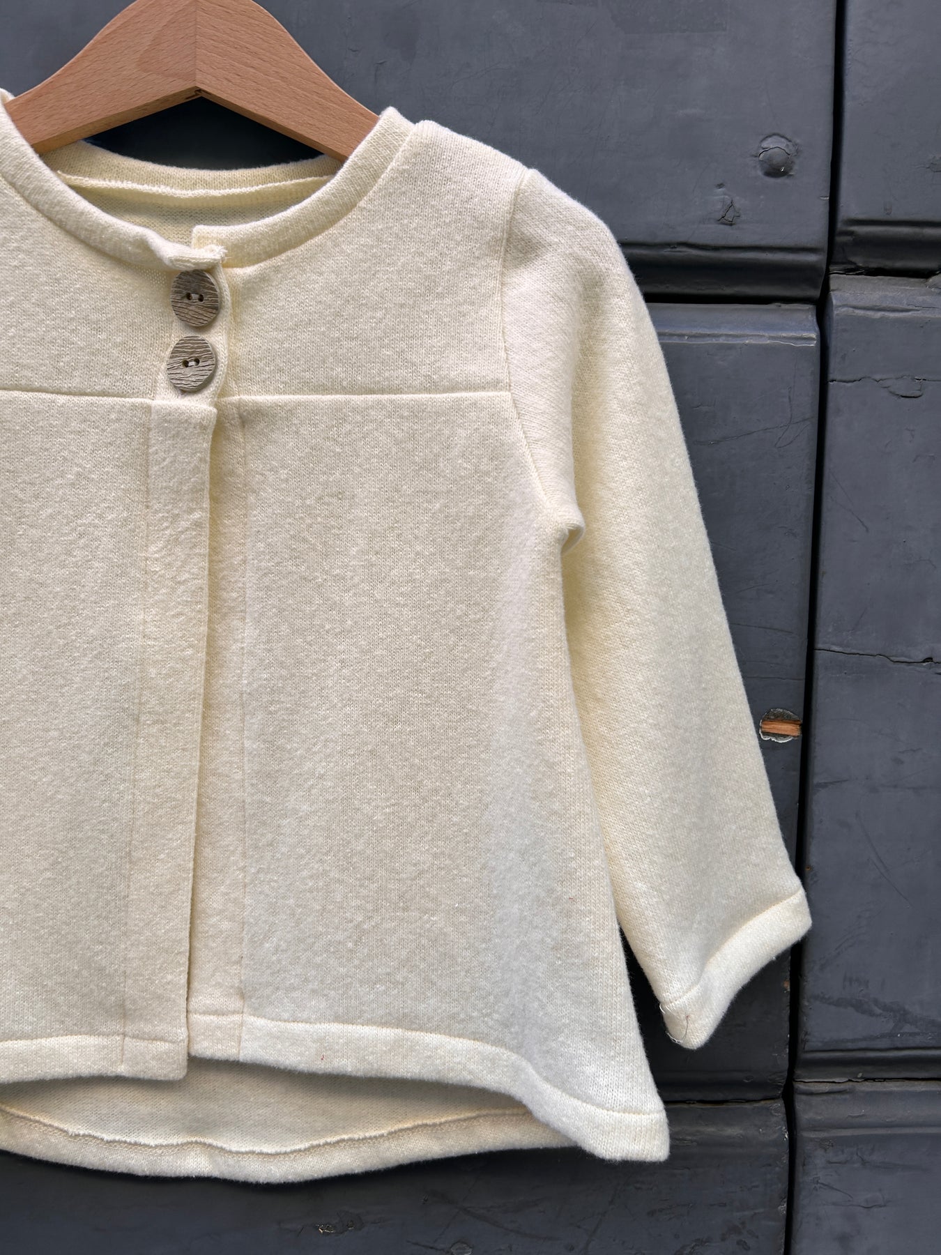 Giacchina in caldo cotone panna con taglio alto, dietro arrotondato e bottoni in chiusura