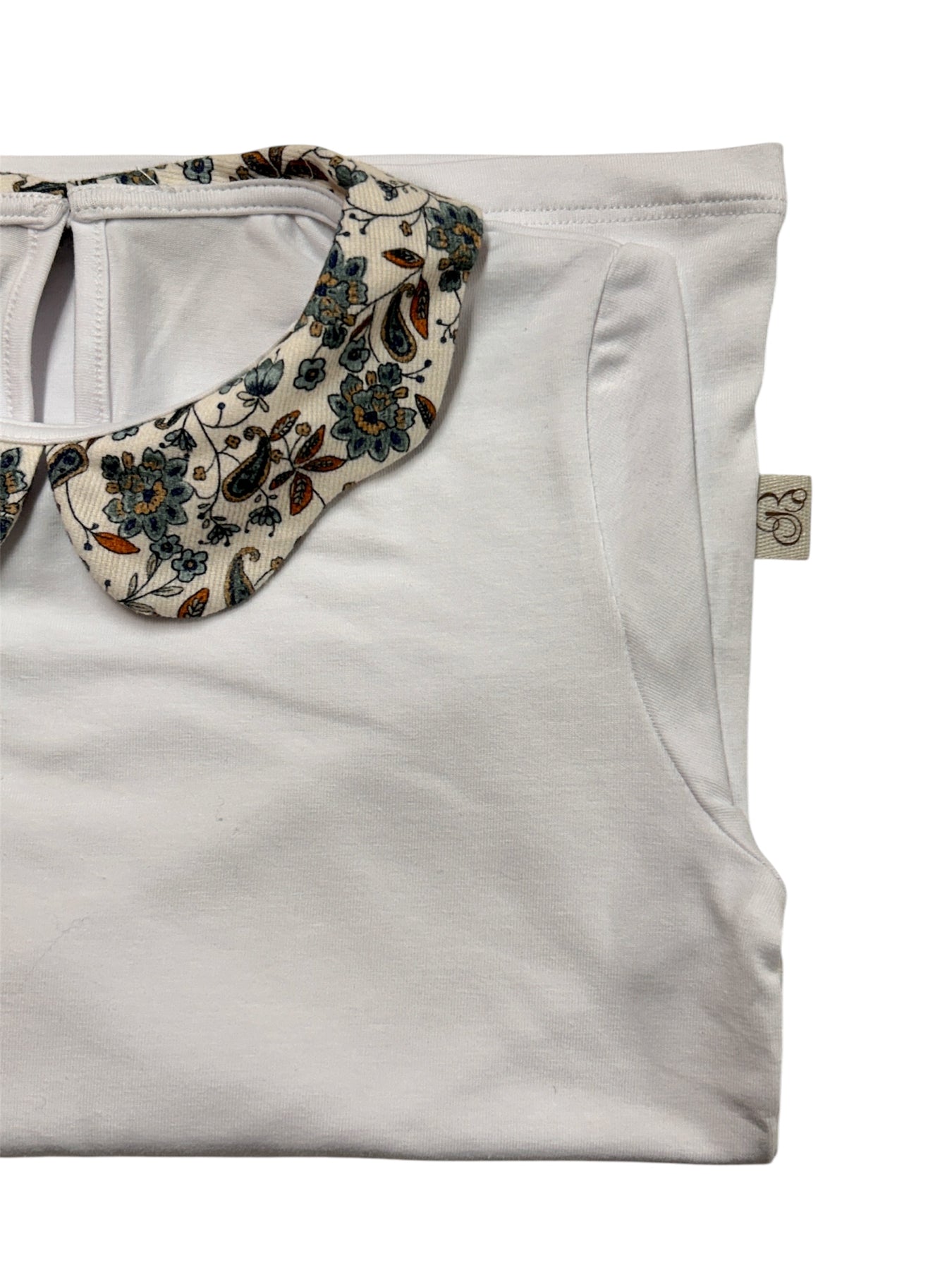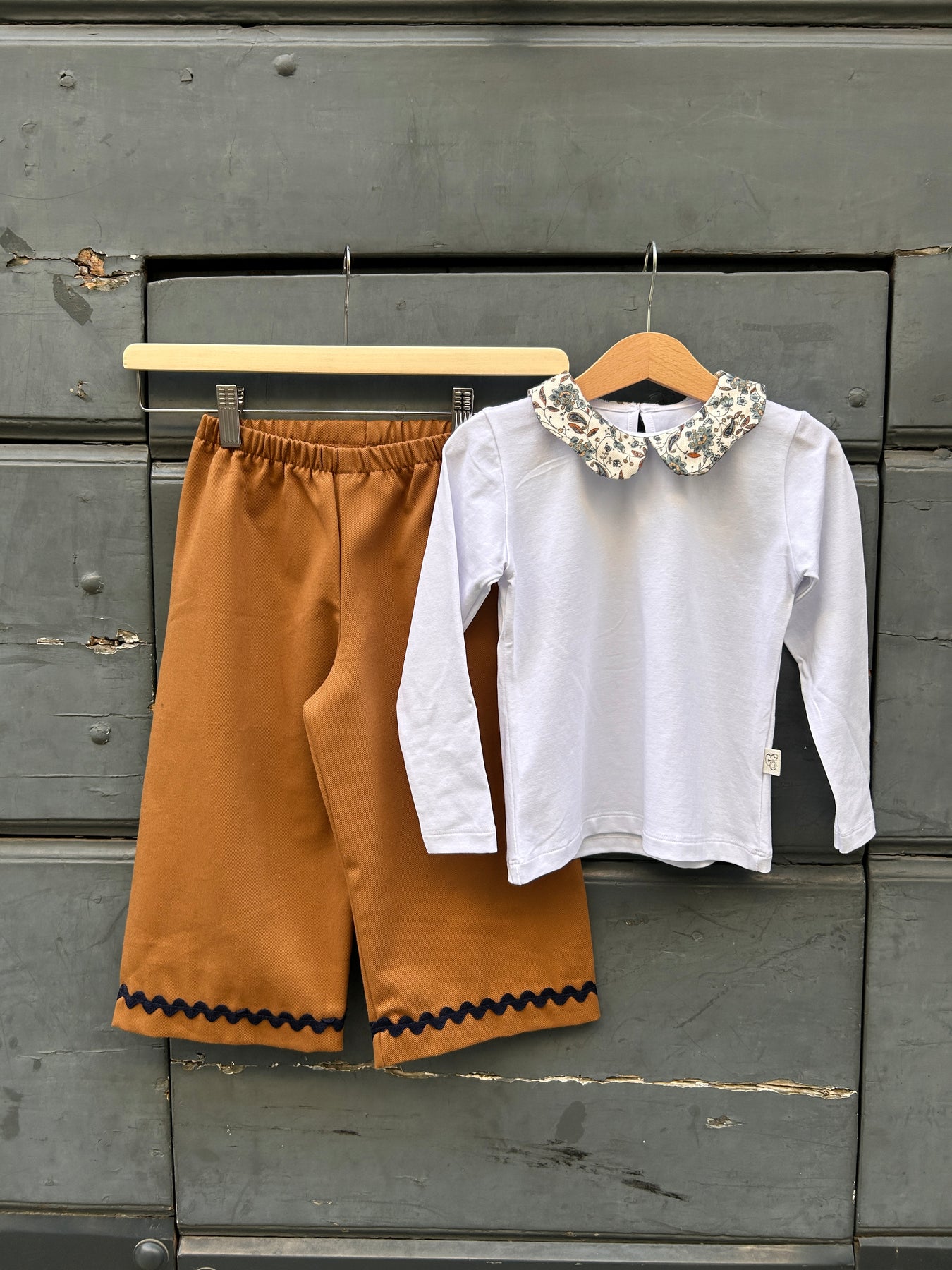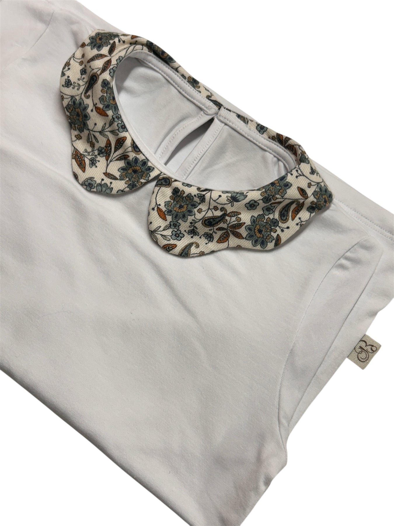 Deliziosa maglietta a maniche lunghe con colletto a petalo a contrasto da poter abbinare ai nostri pantaloni o gonne.