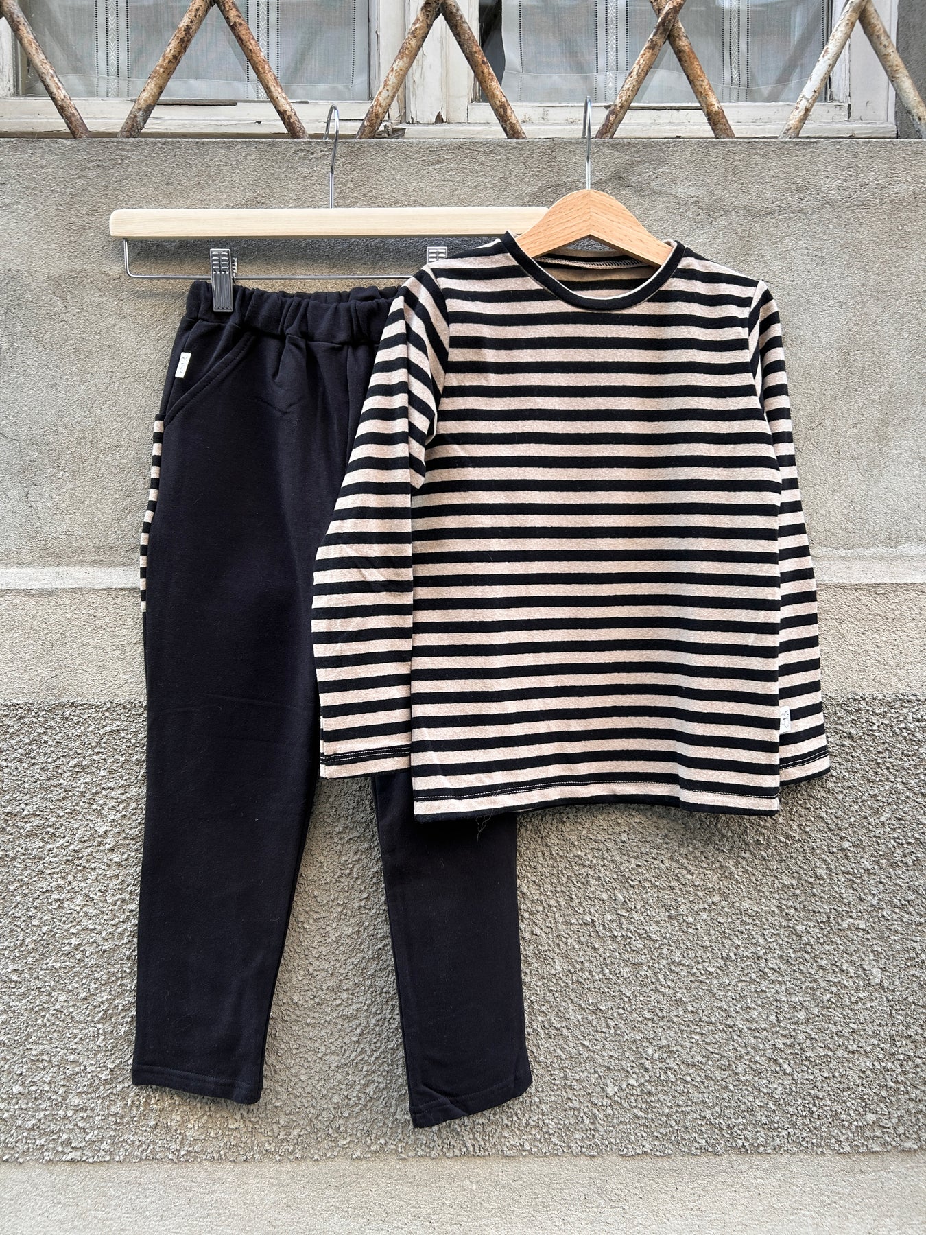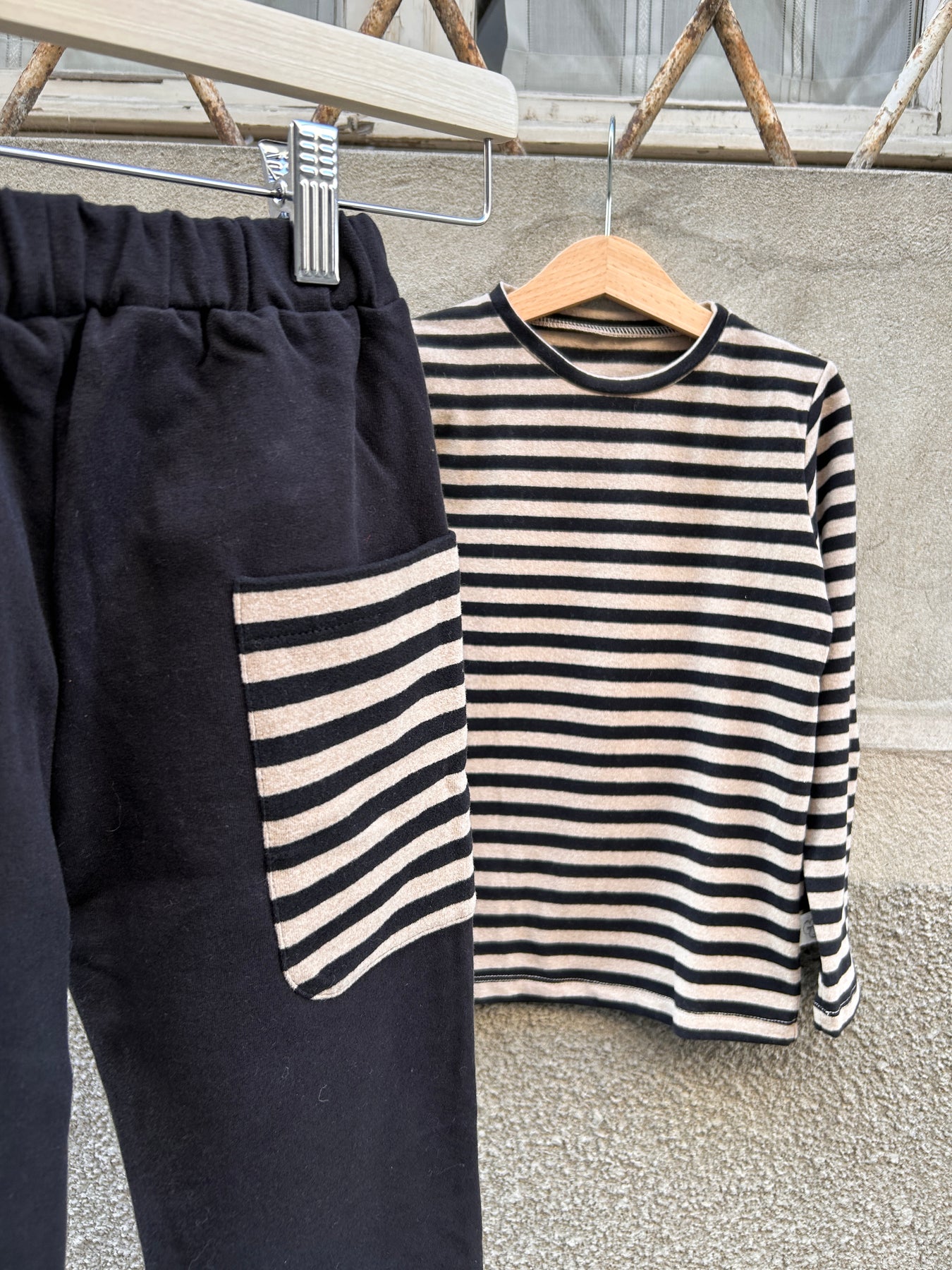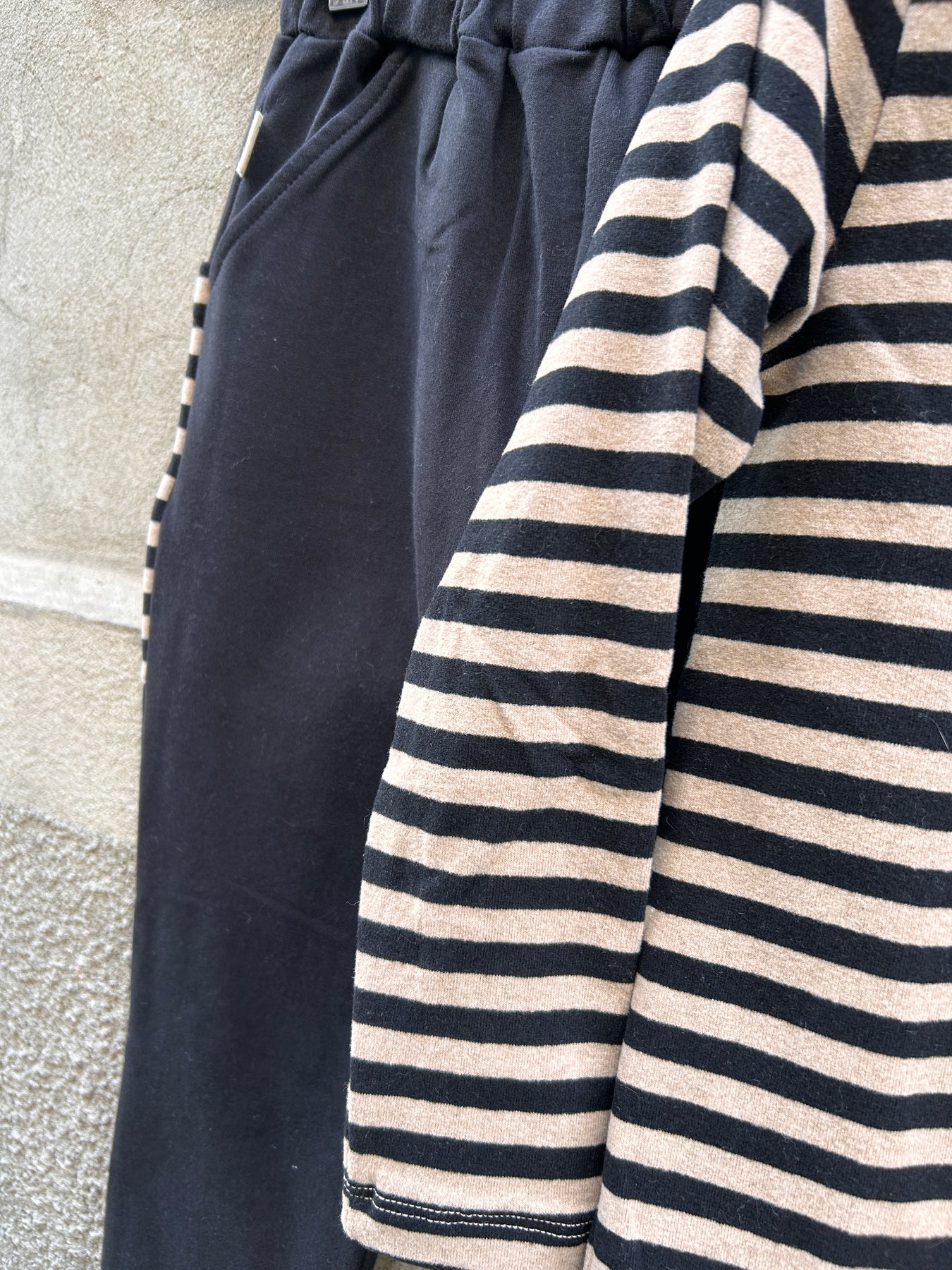 Completo in cotone felpato color nero con bellissimi pantaloni dal taglio comodo e inserti a righe in caldo cotone