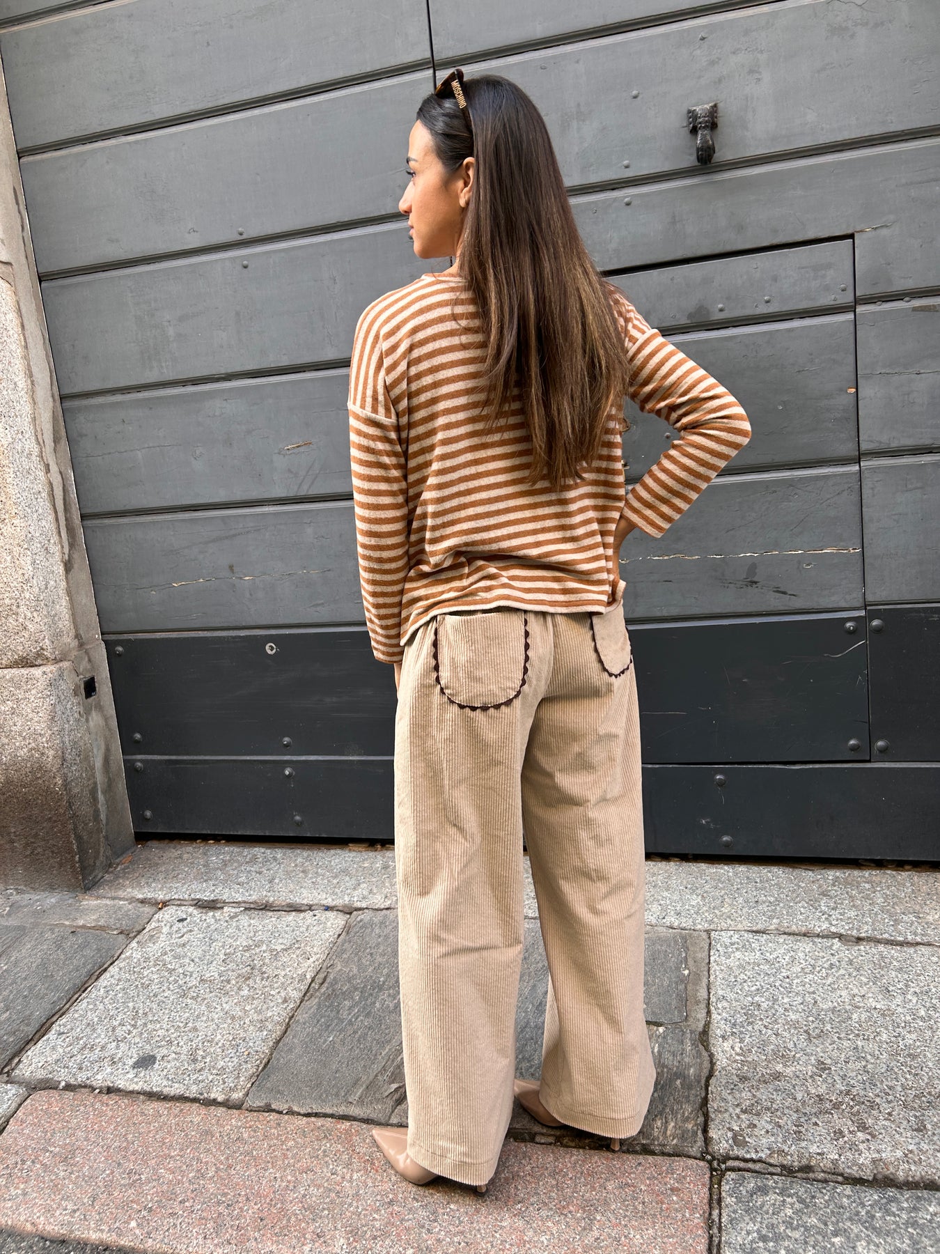 Forma a “scatoletta” per questo capo in morbidissimo caldo cotone a righe beige e marrone