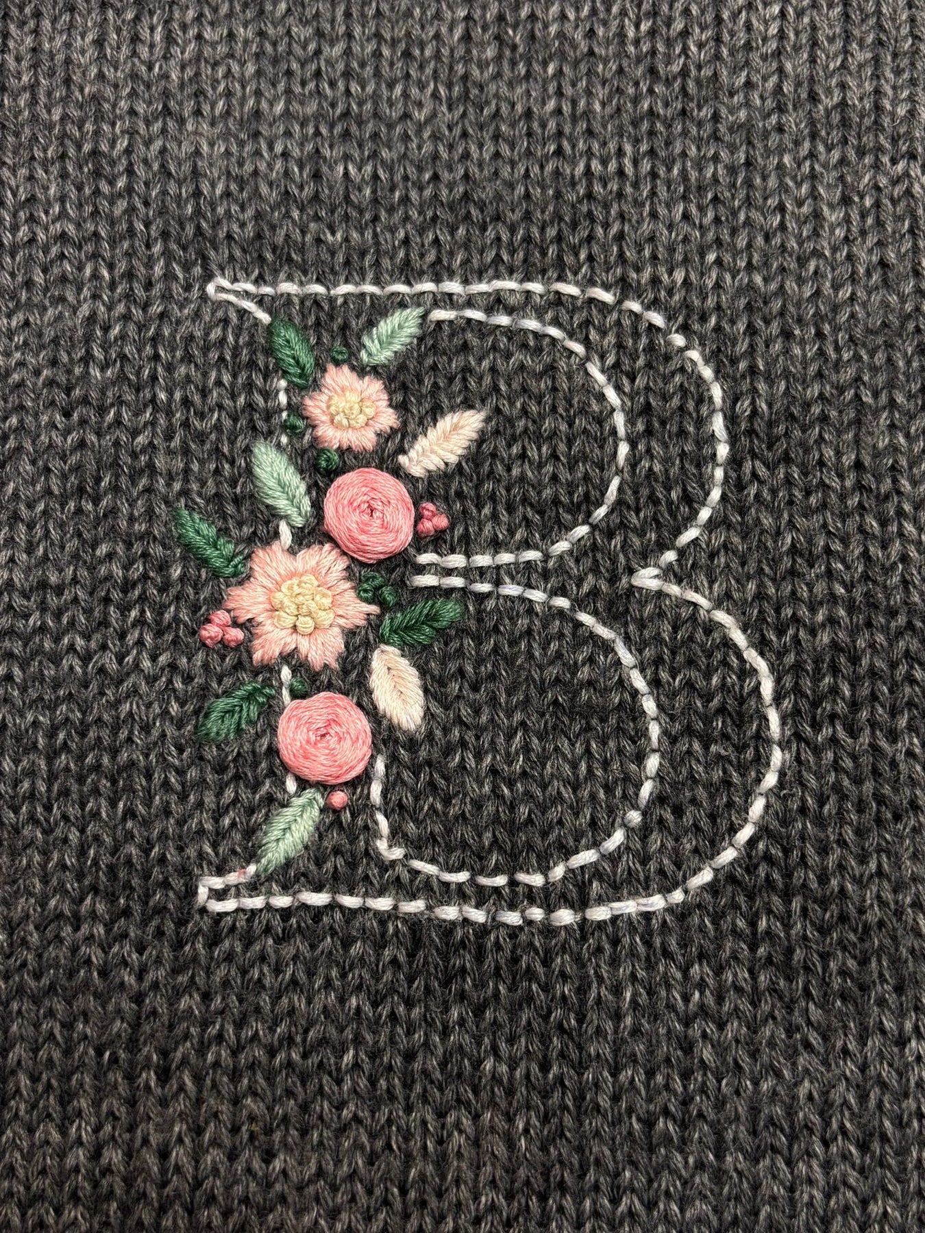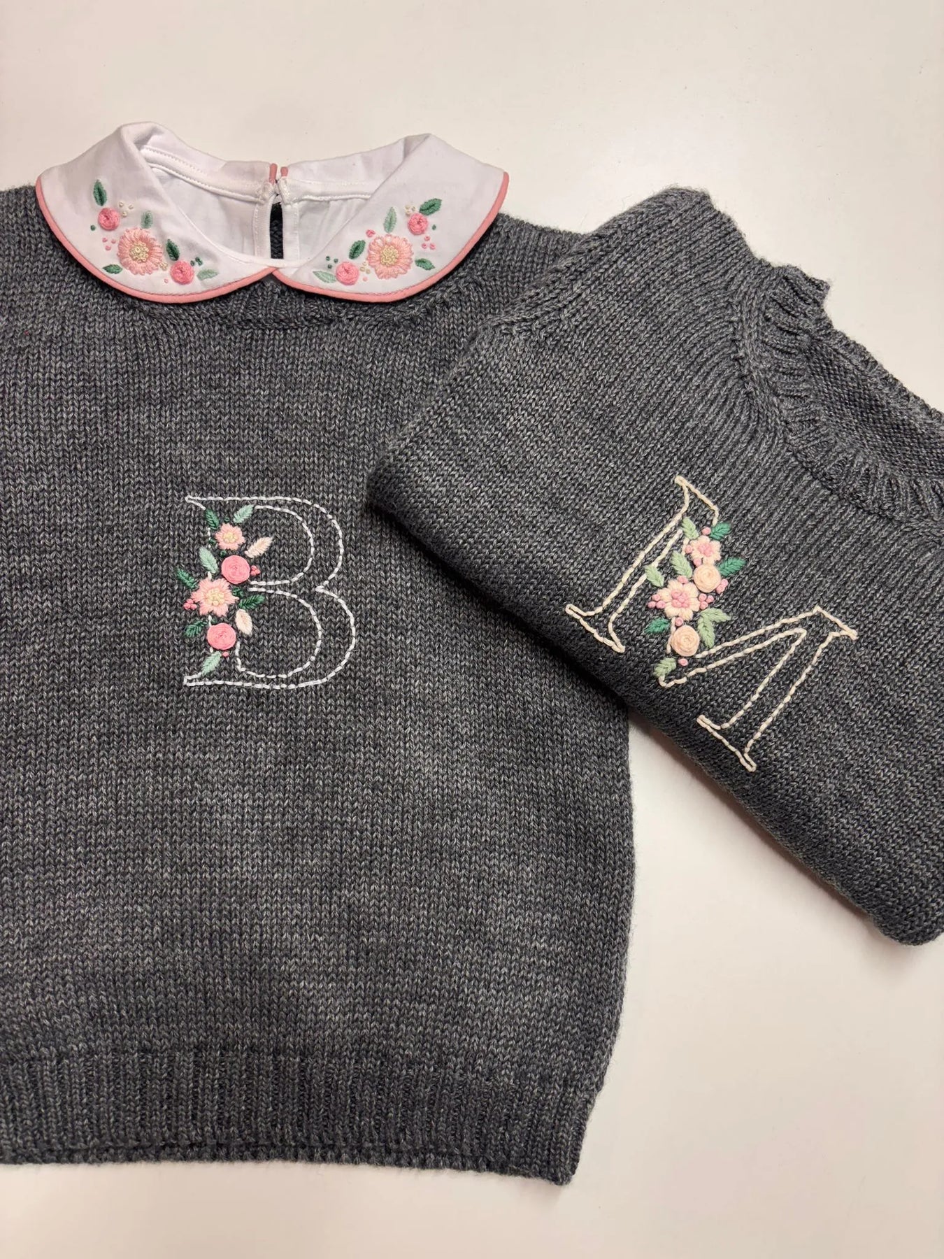 Bellissimo maglioncino con iniziale fiorita ricamata a mano.