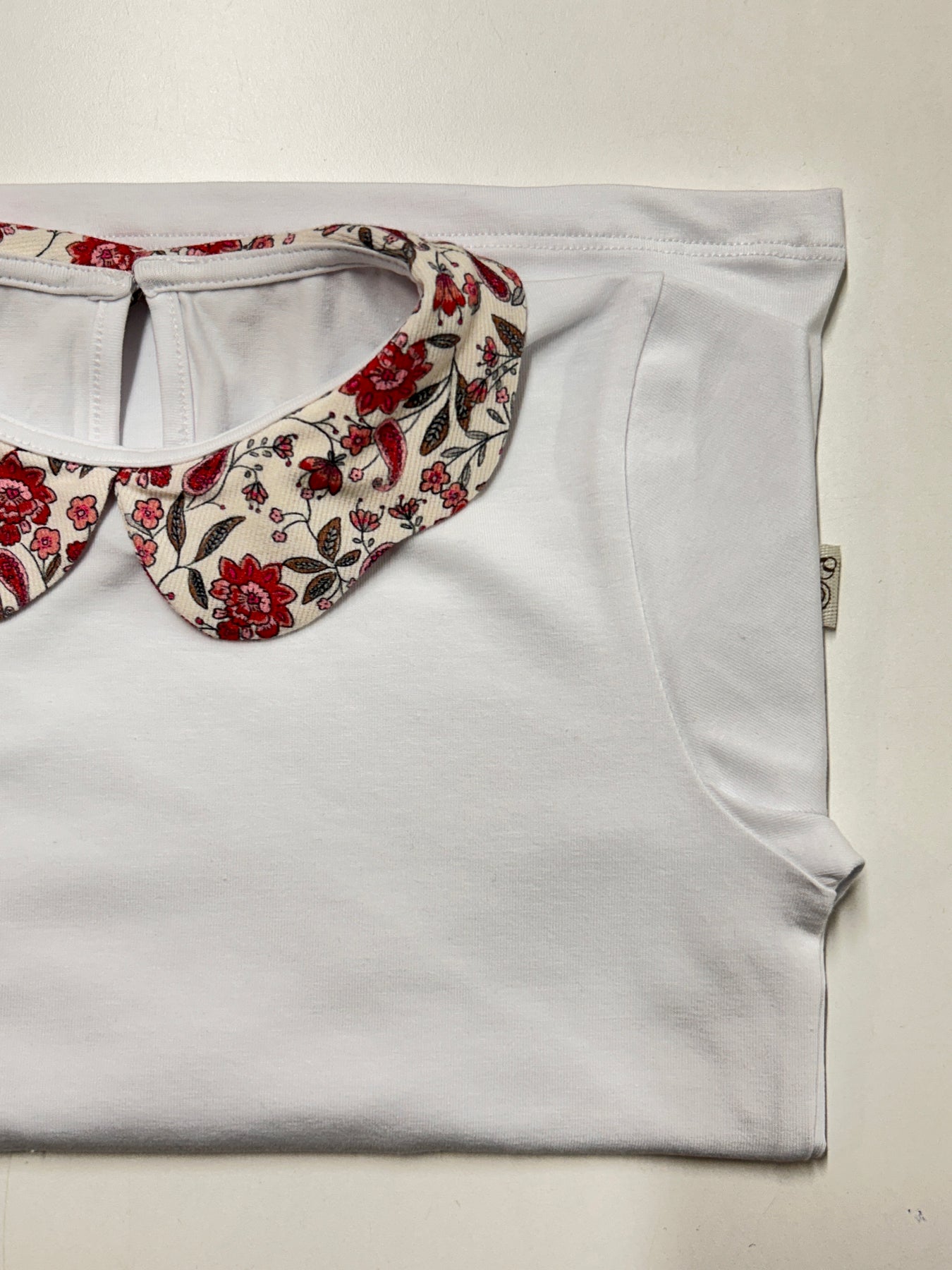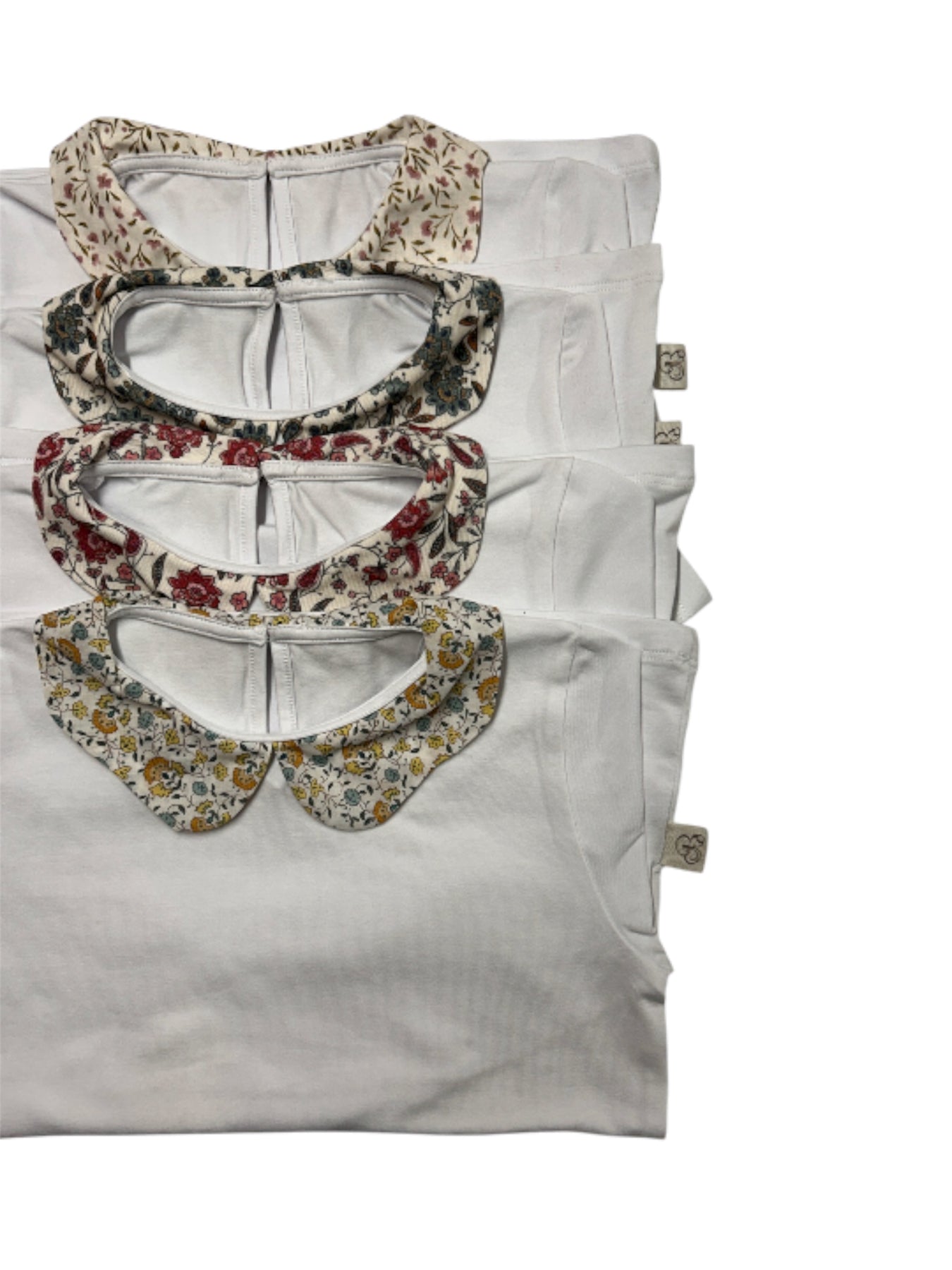Deliziosa maglietta a maniche lunghe con colletto a petalo a contrasto da poter abbinare ai nostri pantaloni o gonne.