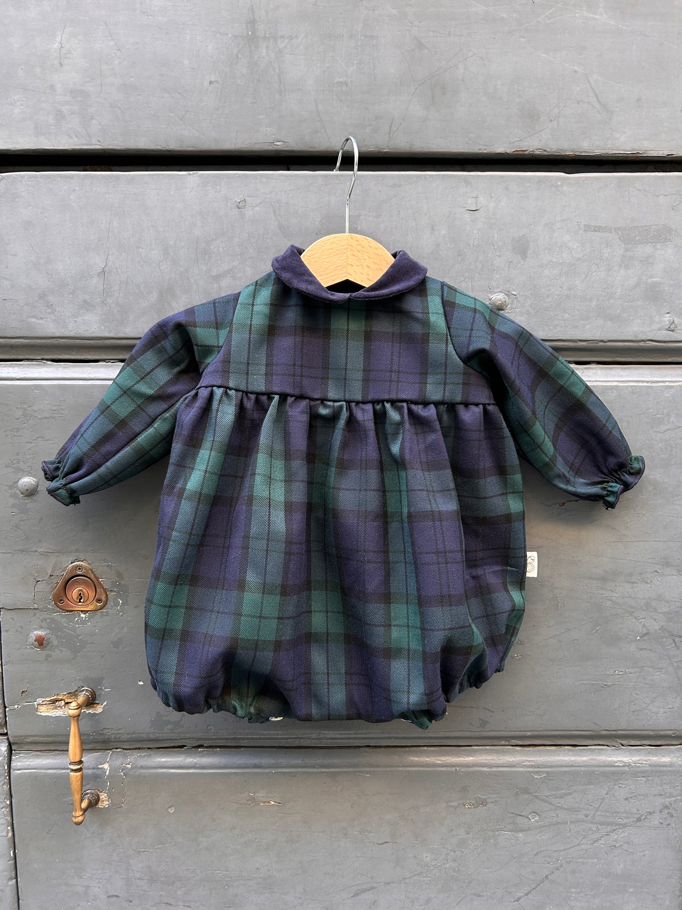 Bellissimo pagliaccetto in cotone pesante fantasia tartan blu con colletto velluto blu