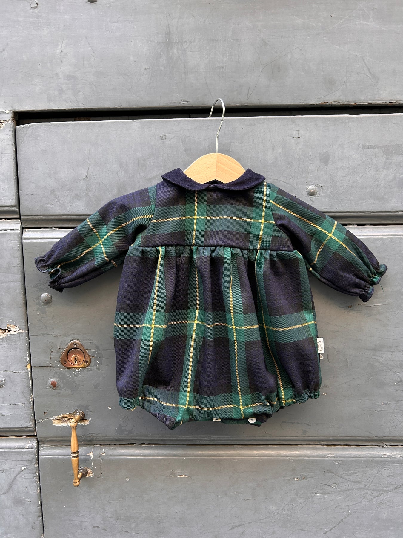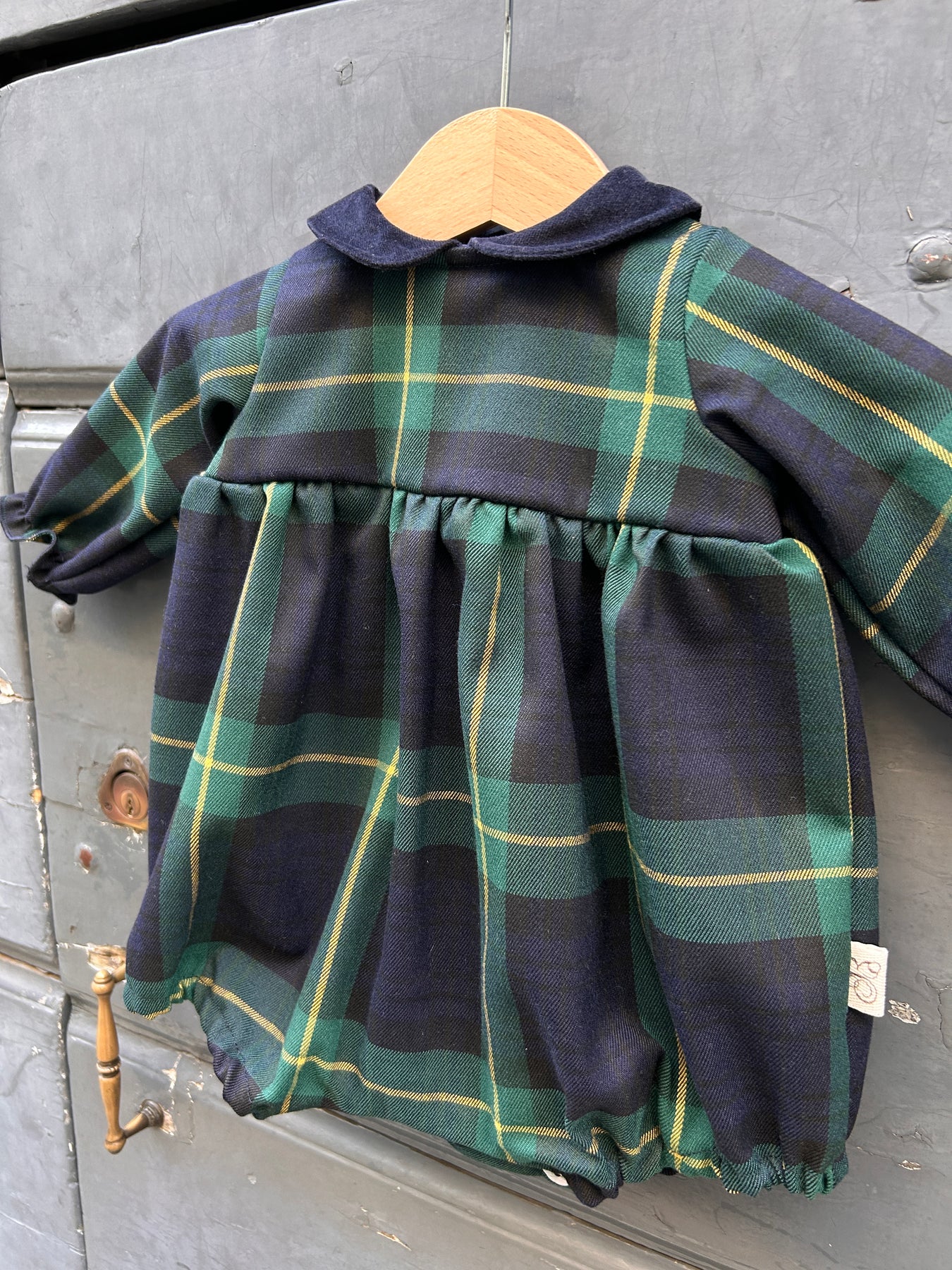 Bellissimo pagliaccetto in cotone pesante fantasia tartan GORDON con colletto velluto blu