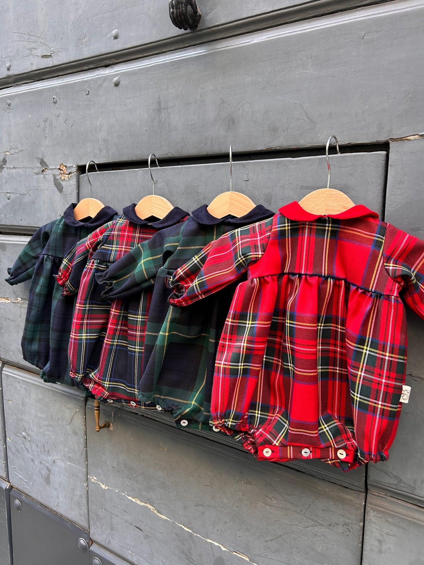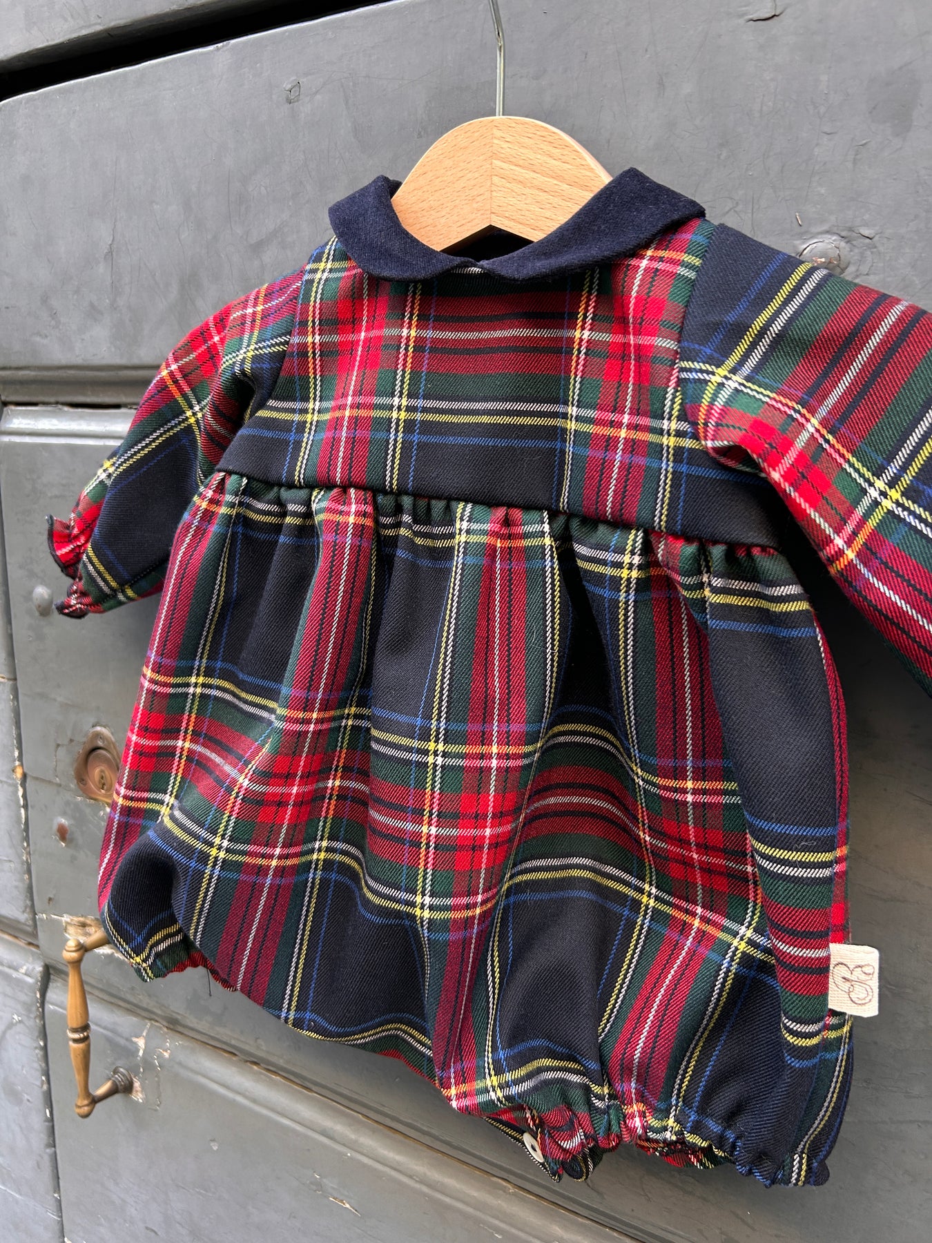 Bellissimo pagliaccetto in cotone pesante fantasia tartan Mary con colletto velluto